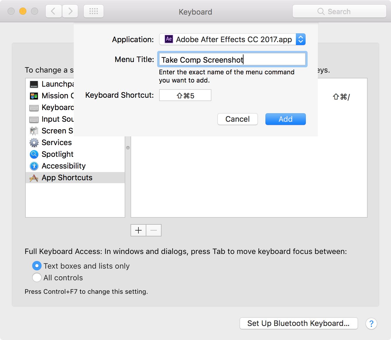 - IMPORTANT: In the Menu Title field, enter the exact phrase "Take Comp Screenshot" without any spaces or quotations. Remember, this is case-sensitive. If you enter this incorrectly, it won't work.